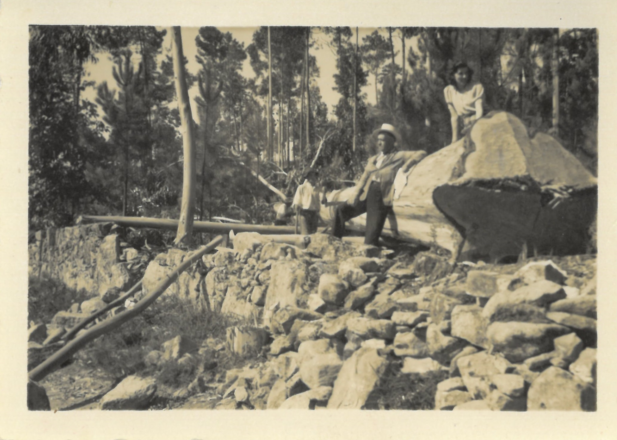 | História documental: | Data atribuída com base na inscrição a caneta no verso desta fotografia: "O grande eucalito do Pégo, por terra... Agosto 1945 Deu 20 toneladas de mad.". Fotografia cedida pela família, aquando da doação do espólio do escritor Manuel de Boaventura. |