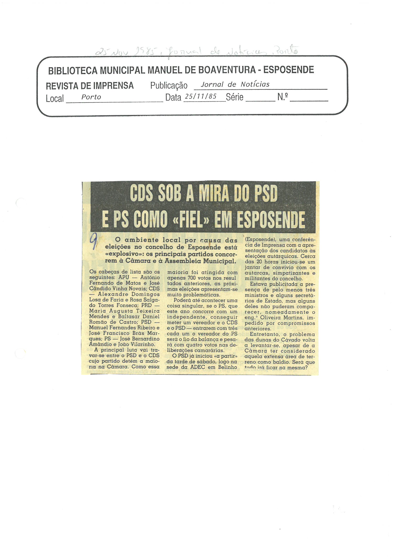 | 25_11_1985_JornaldeNotícias.jpg | CDS sob a mira do PSD e PS como «fiel» em Esposende - 1985 | 337.05 kB | JPEG | ![]() Ver/Abrir |