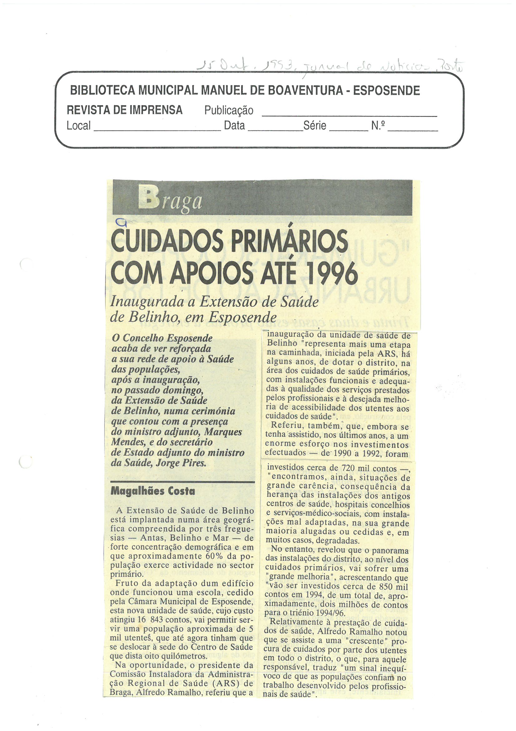 | 15_10_1993_JornaldeNotici.jpg | Cuidados primários com apoios até 1996: Inaugurada a Extensão de Saúde de Belinho, em Esposende - 1993 | 516.71 kB | JPEG | ![]() Ver/Abrir |