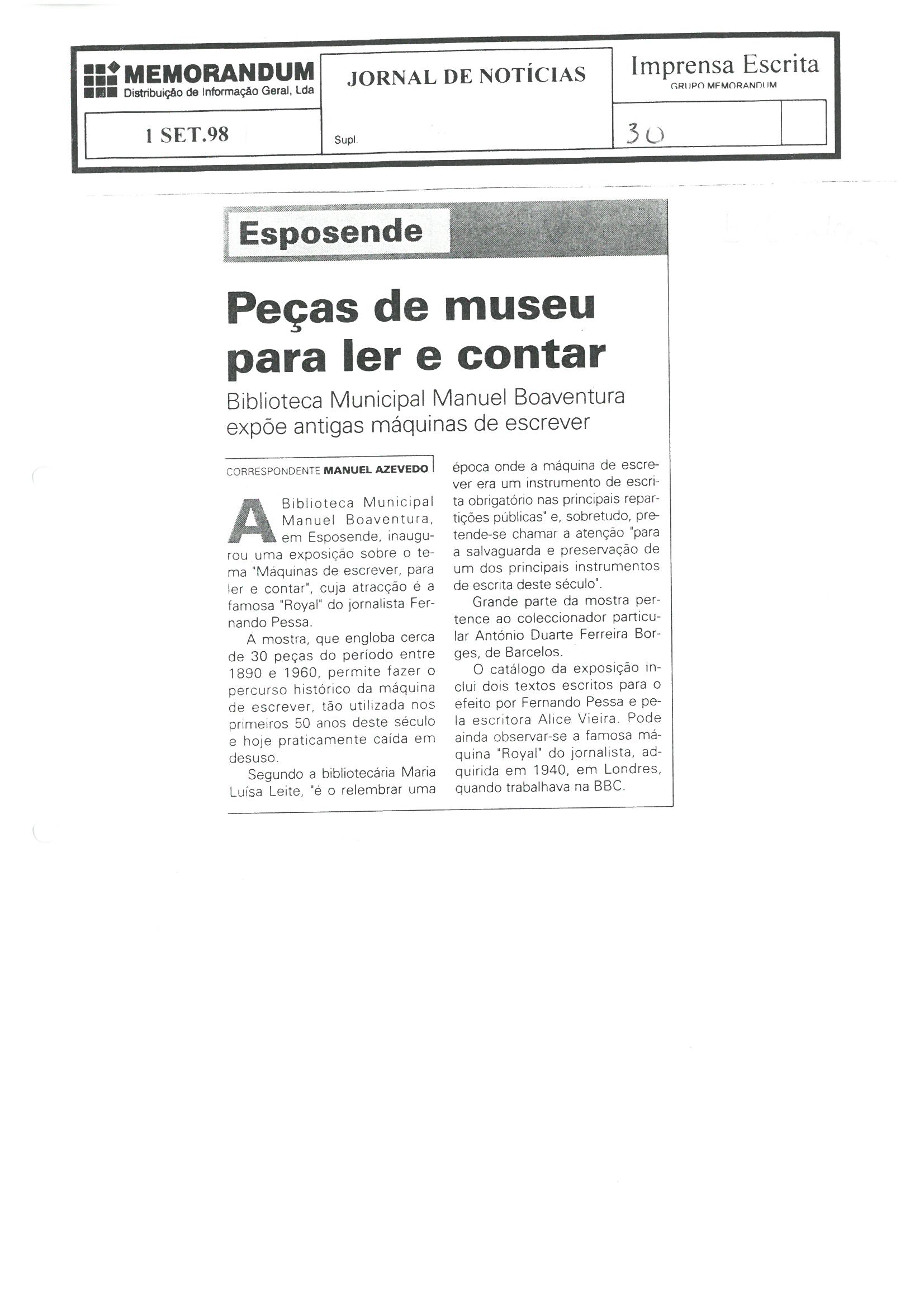 | História documental: | Artigo retirado da publicação "Jornal de Notícias", de 1 de setembro de 1998. |