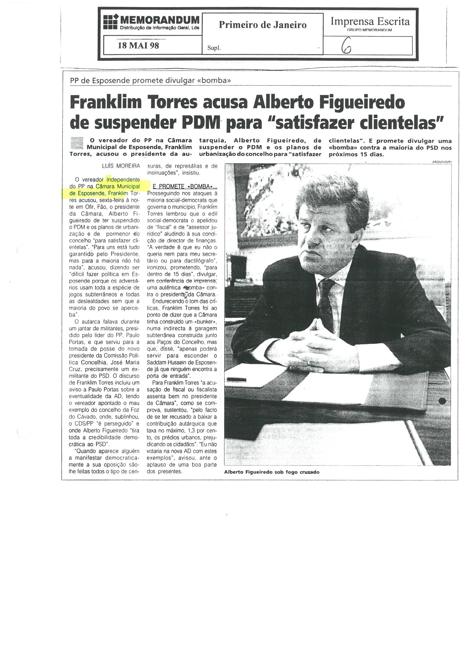 | 18_05_98.Primeiro de Janeiro.jpg | PP de Esposende promete divulgar «bomba»: Franklim Torres acusa Alberto Figueiredo de suspender o PDM para “satisfazer clientelas” - 1998 | 502.09 kB | JPEG | ![]() Ver/Abrir |